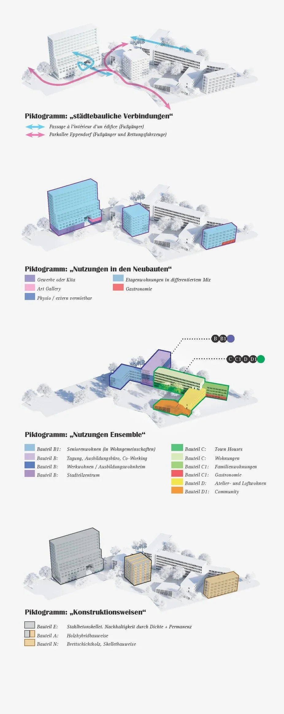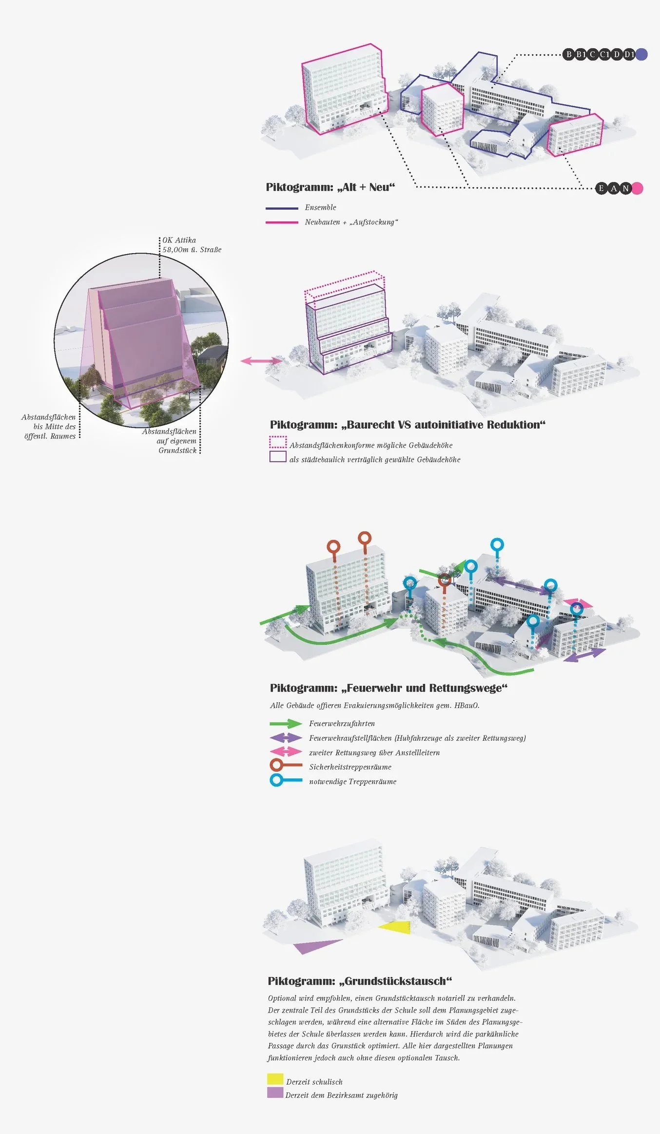 Der Erhalt des denkmalgeschützten Bezirksamts Nord stellt einen zentralen Aspekt der städtebaulichen Entwicklung dieses Geländes dar. In einer Balance aus Bewahrung historischer Substanz und zukunftsorientierter Architektur wird der Bestand des Bezirksamts Nord in seiner ursprünglichen Form maximal erhalten. Gleichzeitig wird das umliegende Areal durch drei architektonisch unterschiedliche Neubauten ergänzt, die sich in Funktion, Form und Ästhetik klar differenzieren und gleichzeitig auf die historische Bausubstanz Bezug nehmen.